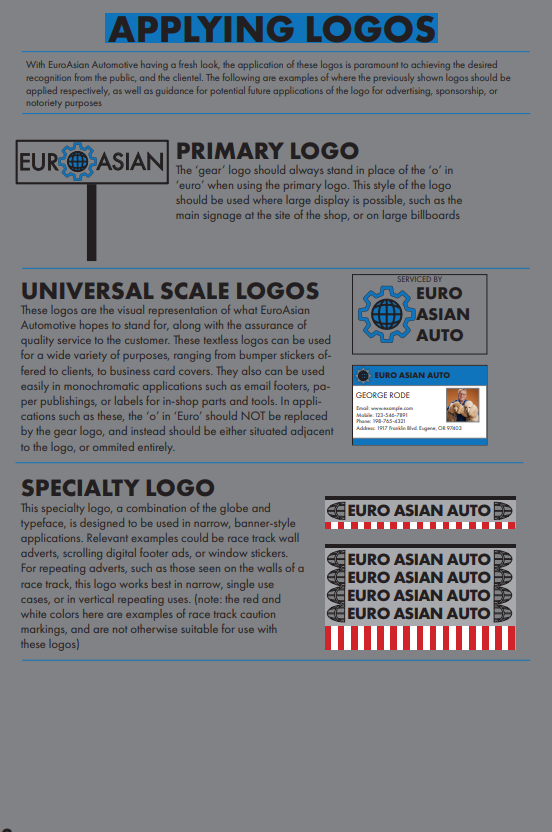 For a design class in the school of Journalism and Communication, I was tasked with rebranding a local business that was deemed ‘poorly designed’ branding, and rebrand them. The result was a 5-page, detailed brand book for a completely new appearance for EuroAsian Auto. This included details on the typeface, color, and phrasing requirements, as well as examples of potential uses in advertising and brand applications. I have continued to refine this project and use it as inspiration for new, similar personal projects